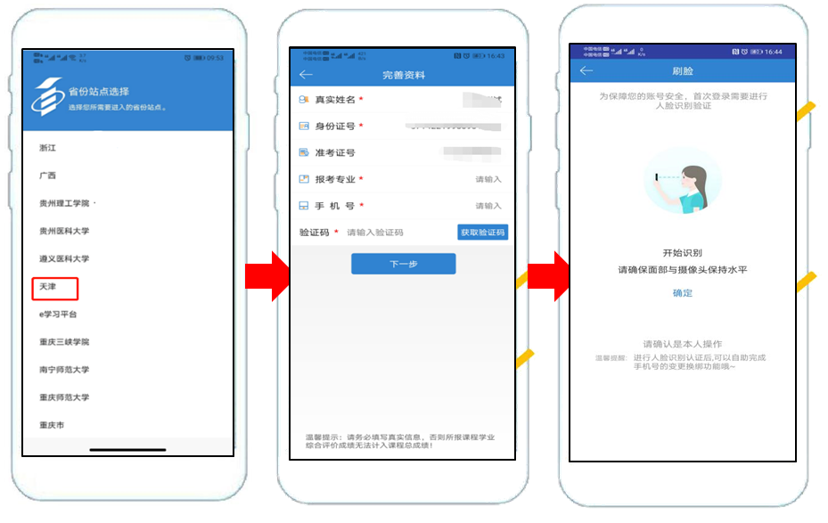 1)首次登录软件,站点选择“天津”,补填考生个人信息,上传面部信息进行身份校验。