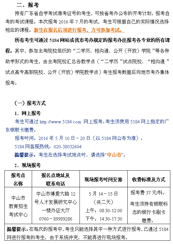 2016年7月中山自学考试报名时间安排