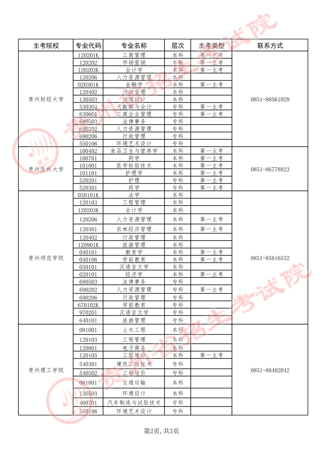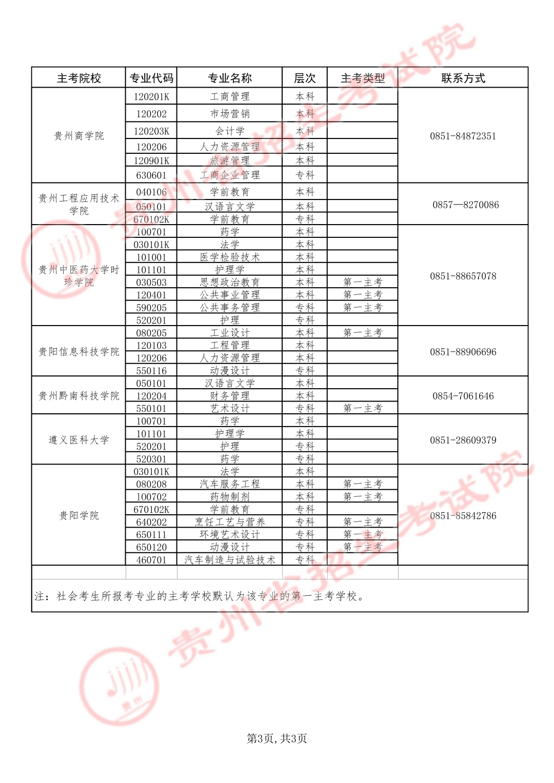 1.贵州省高等教育自学考试各专业主考学校信息表