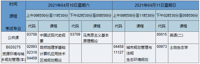 2021年4月湖南自考本科资源环境与城乡规划管理专业考试时间为2021年4月10日-11日,2021年4月湖南自考本科资源环境与城乡规划管理专业课程安排如下: