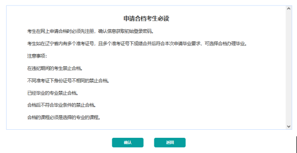 3.从2021年下半年起,省招考办为辽宁省内有多个准考证号的考生提供网上申请合档办理毕业业务。考生在多个准考证号的成绩合档后符合本次申请毕业的要求,才可以进行申请合档办理毕业。(具体操作流程详见附件《申请合档办理毕业说明》)合档申请审核通过后方可进行毕业申请。