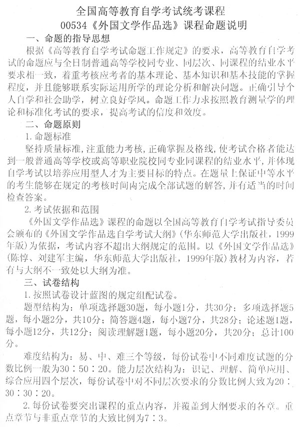 全国09年调整外国文学作品选试卷结构通知