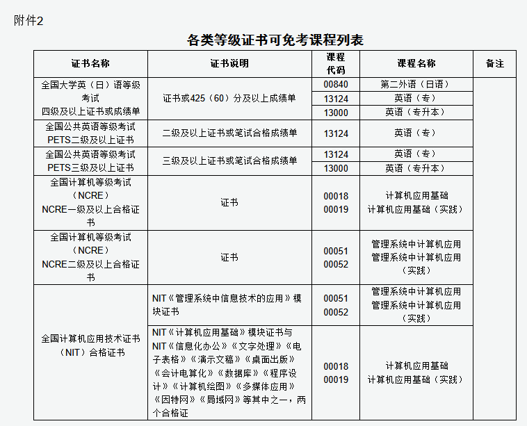 第九条 获得国家承认的有关等级证书持有者报考高等教育自学考试可免考专业考试计划规定的课程,具体详见附件2。