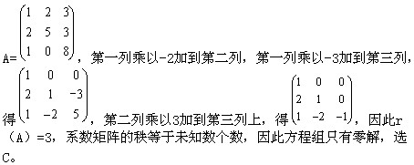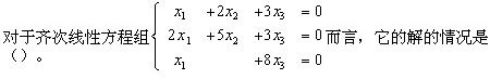 答案解析:本题考查齐次线性方程组解的情况。这是一个齐次线性方程组,只需求出系数矩阵的秩就可以判断解的情况。系数矩阵
