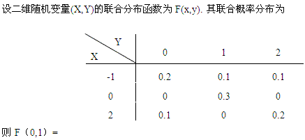 答案解析:本题考察二维随机变量分布函数的定义。+=也可用对立事件来计算,由对偶律,所以=1-[0.3+0.3-0.2]=0.6故选择B。