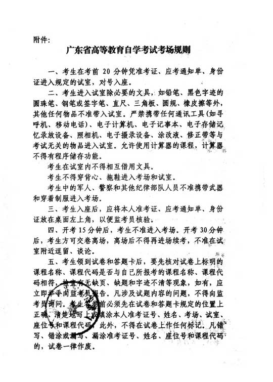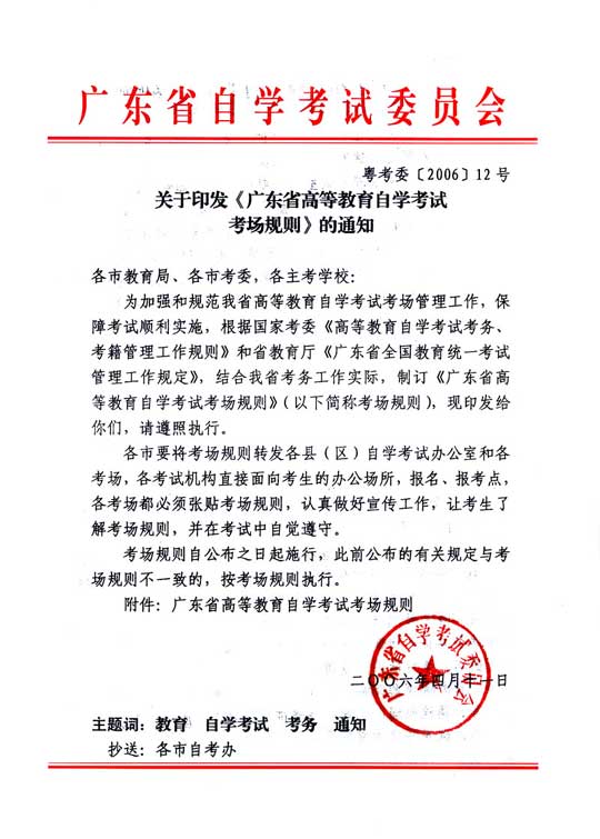 首页 > 考务考籍> 广东考务考籍 > 印发《广东省高等教育自学考试考场规则》的