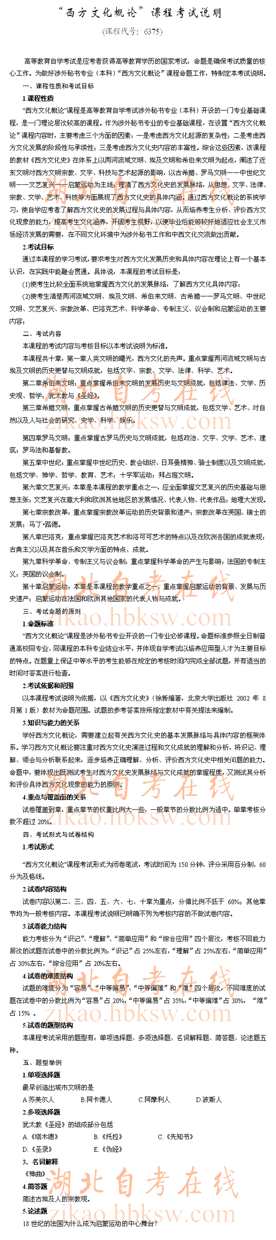 首页 > 教材大纲> 自考“西方文化概论”(6375)考试说明