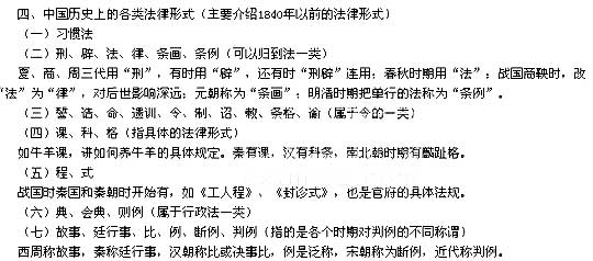 掌握几个朝代的主要法律形式,如汉朝的律、令、科、比;唐朝的律、令、格、式;宋朝的敕、令、格、式。