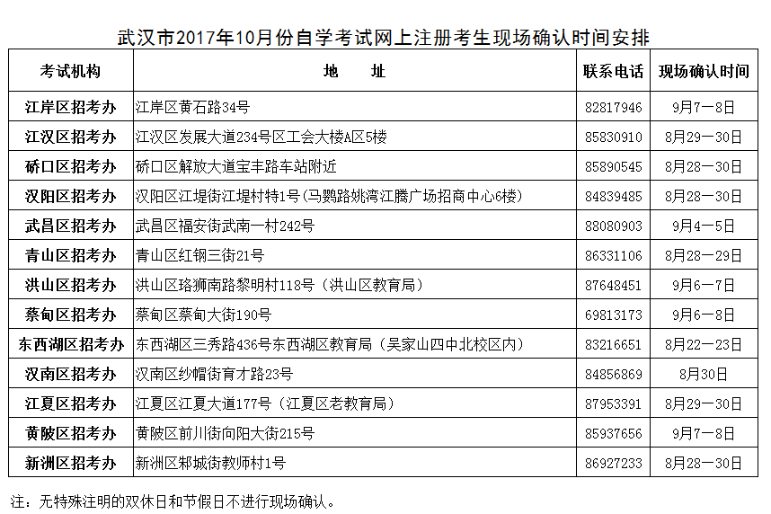 2017年10月武汉市自考网上注册考生现场确认时间安排