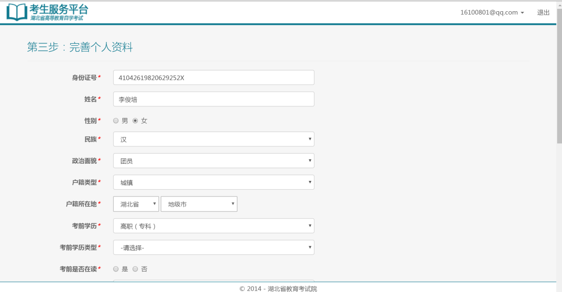选择一条在籍信息后,平台会调出此条在籍信息的全部信息,考生完善修改信息