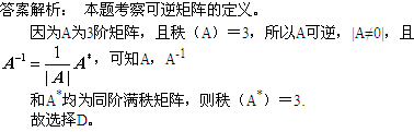 1、【2011·4】设 A为3阶矩阵,A的秩r(A)=3,则矩阵A*的秩r(A*)=( )