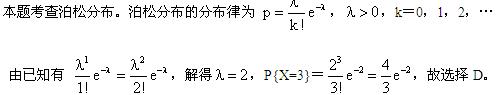 1、【2012.01】设随机变量X服从泊松分布,且已知 P{X=1}=P{X=2} ,则P{X=3}=( )。