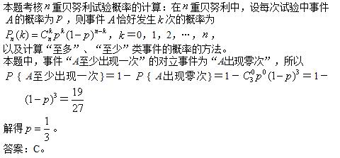设在三次独立重复试验中,事件A出现的概率都相等,若已知A至少出现一次的概率为,则事件A在一次试验中出现的概率为