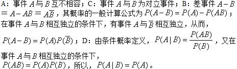 答案解析:本题考察两事件的互不相容、对立、相互独立的概念及其概率,以及条件概率的概念及其计算。
