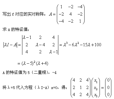 用正交变换化下列二次型为标准形:f(x,y,z)=x2+4y2+z2-4xy-8xz-4yz( )